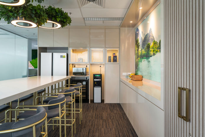 Trirec Fund follows a modern luxury theme with a mix of corporate branding, natural elements, and refined materials. The color palette consists of neutral tones (whites, greys, and wood accents) complemented by deep blues and gold highlights, creating a balance of professionalism and sophistication. The integration of biophilic design, textured walls, and lighting accents enhances the workspace’s warmth, creativity, and productivity.